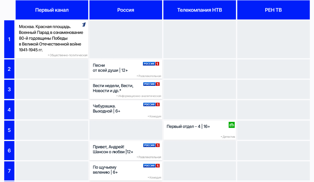В 2025 году традиционно особое внимание зрителей было приковано к трансляции парада ко Дню Победы. Именно она собрала самую большую аудиторию, возглавив рейтинг. Данная тенденция сохраняется из года в год: общественно значимые телесобытия, такие как парад и новогоднее обращение президента России Владимира Владимировича Путина, традиционно привлекают к экранам максимальное количество зрителей, занимая верхние строчки рейтинга.